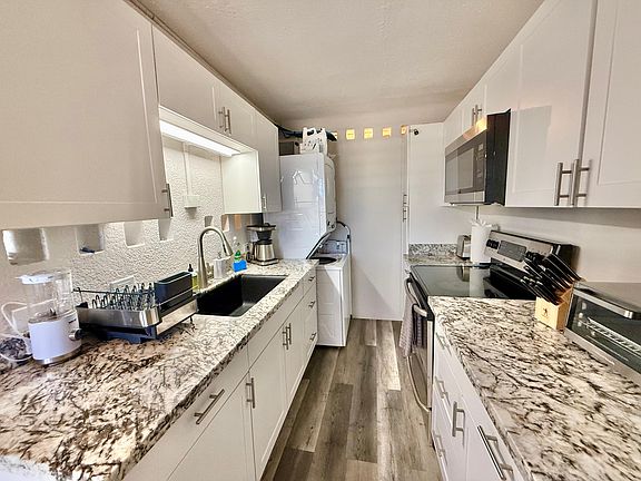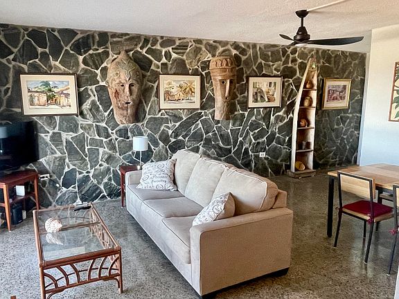 This gorgeous, completely renovated upper-level one bedroom unit has beautiful Buck Island views and an elegant mid-century modern aesthetic. The comfortable and spacious great room features lovely terrazzo floors, a natural stone accent wall, and opens onto a breezy patio overlooking the Caribbean Sea. The all-new bath has beautiful tile and stonework, and the new kitchen features stone countertops, new stainless appliances and a washer/dryer. Enjoy a nice breeze or A/Cs throughout the unit.The convenient mid-island location is close to town and minutes from beautiful North Shore beaches. The intimate condo complex has a lovely pool and with the low monthly maintenance fees, this is the best condo value available on St. Croix today.