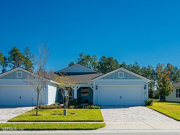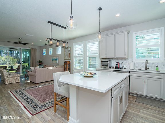 Located on one of Del Webb Nocatee's premier lots this light and airy Ellenwood is a rare find! As you step inside you will be welcomed by the light driftwood colored flooring with stunning water to preserve views. Original owner has spent over $25,000 in upgrades after the home was built! Find the additional space you need with a versatile Flex Room just off the Foyer that can be utilized as an In-Home Office or Library with glass doors. The private Owner's Suite features a large Walk-In Closet, Private Water Closet, Linen Closet, and Walk-In Glass-Enclosed Shower. The original owner has added custom closets in both bedrooms, Pottery Barn lighting over dining area and island, new fans in entire home, a new custom covered lanai, pavers, board and batten accent wall in primary bedroom, water softener and so much more! The home features great entertaining space inside and outside. Step outside on your lanai and you'll hear the birds chirping or see an occasional deer in your backyard. Peaceful and quiet as you sit with your morning coffee or spending time with friends over a glass of wine! This villa is less than a five minute walk to the Canopy Club. Live maintenance free in the highly desirable villas! Del Webb Nocatee, the newest 55+ community where luxury living meets unparalleled amenities including: resort pools, spa tub, pickleball, tennis, bocce, billiards, a full service restaurant and bar, ballroom, fitness center, community garden, kayak launch to the intracoastal etc. If that is not enough, you can enjoy all that the community of Nocatee has to offer just a few miles away on golf cart paths, including waterparks, concerts, food trucks, restaurants and shopping.