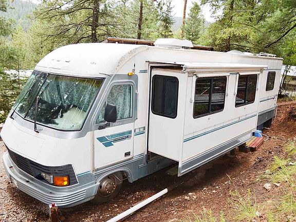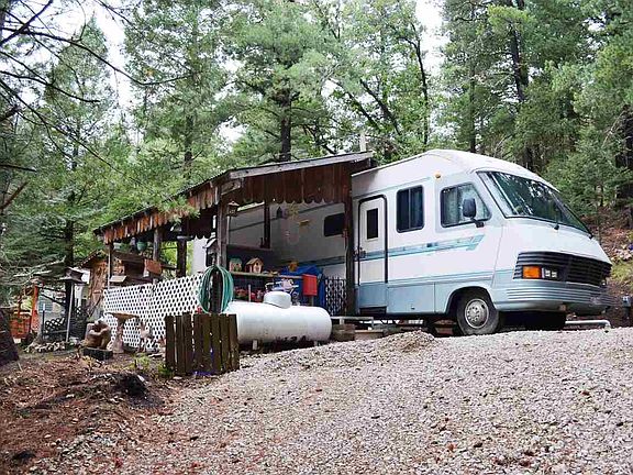 Turn key mountain getaway Bordering National Forest! This beautifully wooded lot comes with a 94 class A deluxe motor home w/new tires, fully equipped with 2 queen beds, & slide out. Enjoy a nice covered deck that includes a washing machine, storage building, and small dog run. Propane tank is owned but not hooked up (RV has built in propane tank), newly graveled driveway, & septic holding tank. Come up and enjoy the cool mountain air, tall pines, and abundance of wildlife from the comfort of your porch.
