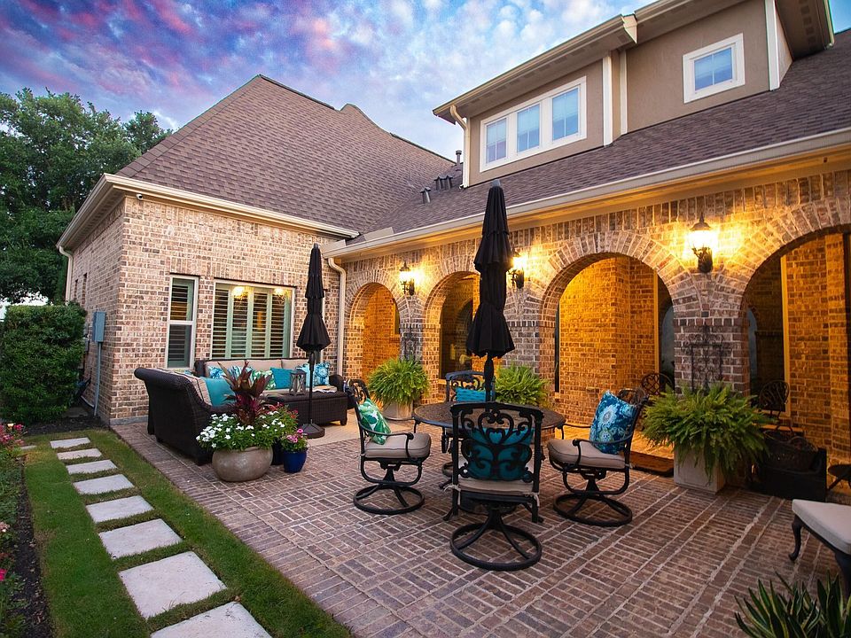 Private brick courtyardFloor-to-ceiling windowsLimestone patioFull-length lap poolVaulted ceilingsLush landscapingOversized walk-in closet