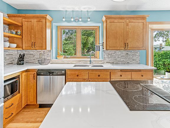 Spend the summer poolside! This well maintained 4 bed, 3 bath rambler near Bunker Hills has a lot to offer. Main level living with 3 bedrooms including a primary suite with walk in closet. The kitchen has beautiful stone countertops, plenty of storage and a serene view from the eat in area. The attached 3 season sunroom has tons of natural light and separate door to the backyard oasis. There you will find an enormous paver patio surrounding the inground pool. Relax in this private setting and let the dog run free in the fully fenced yard. Attached pool shed organizes all the toys and equipment. The lower level has a large family room with a cozy, gas fireplace, 4th bedroom, oversized bathroom/changing area, laundry room and storage space. There’s an egress window to add a 5th bedroom and plumbing rough in for a 4th bath also on the lower level. Newer roof (2019), windows, air conditioning/furnace, water heater. Move in and enjoy!
