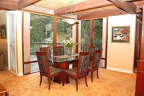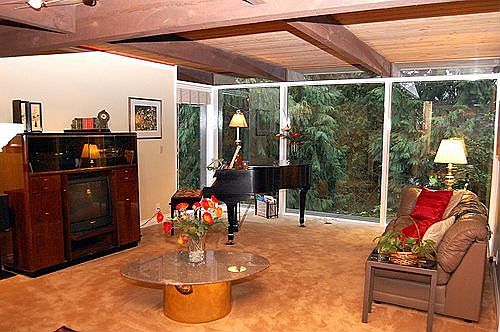 Exquisite Frank Lloyd Wright Styling is the focus of this 3100+ sqft Home sitting in Your Own Private Wooded Sanctuary. Step onto the Oak Hardwood Floors throughout the Main Floor with Walls of Windows. Many updates including Granite Counters, Skylights, Jetted Tub & Solarium. Master & Two other Bedrooms on Main Floor with a Den & Office (both with closets) downstairs. Newer Roof & Deck. Sprinkler System. All Furniture and New Appliances STAY with Home.