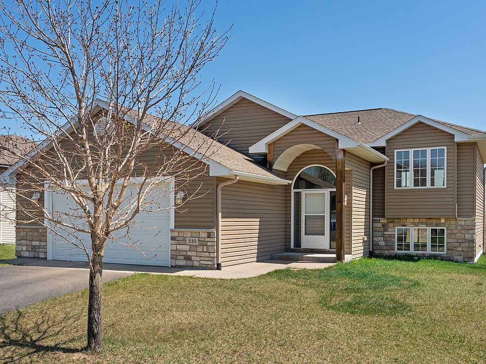 Beautiful 3 BR, 2 BA home on corner lot in popular development! Large, open living into kitchen area. SS appliances, gorgeous oak cabinets, Corian counters, plus hardwood flooring. Owner's suite w/ private full bath. Unfinished basement has limitless potential. Gorgeous windows lend great light. Bonus features: plumbed for potential 3rd bath, plus water softener, air-to-air exchanger & storage area. Gorgeous exterior finishes. Mature trees in large backyard. Nearby schools. Easy access to 65.