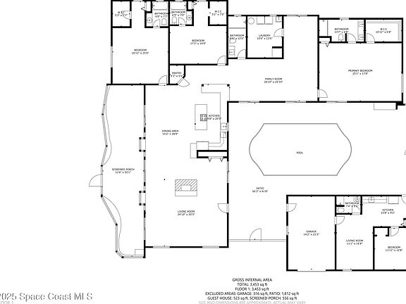 2 HOMES-2.5 ACRES-ENDLESS POSSIBILITIES!! Main home has 4240 SF, 3 bdrms each with their own en-suite bath and walk-in closets. Features include a spacious and open floor plan, perfect for entertaining. Recently remodeled kitchen with white shaker cabinets, quartz, SS appliances and huge island. The In-law suite is next to the main home with 1/1 and small kitchen. Guest home is almost 2100 SF with 4/2/2. (tenant in place mo. to mo.) There are 7 garages for boat, RV storage + workshop. Incredible sunsets overlooking the private pond, or view the courtyard pool (re-surfaced in '22) from anywhere in the home. Outdoor screened lanai and grilling area, flag lot and private natural foliage. Roof updated in '18, new AC '22, new luxury vinyl floors in main living areas and 2 new septic tanks '22. This truly versatile estate has so much to offer with the income potential and multi-generational living opportunities for extended families. Close to the KSC and easy access to the beaches! no HOA!