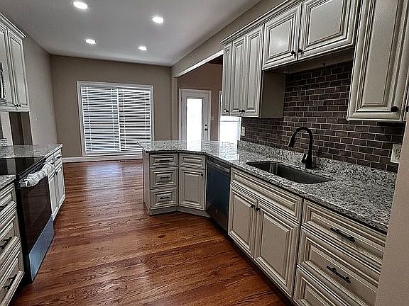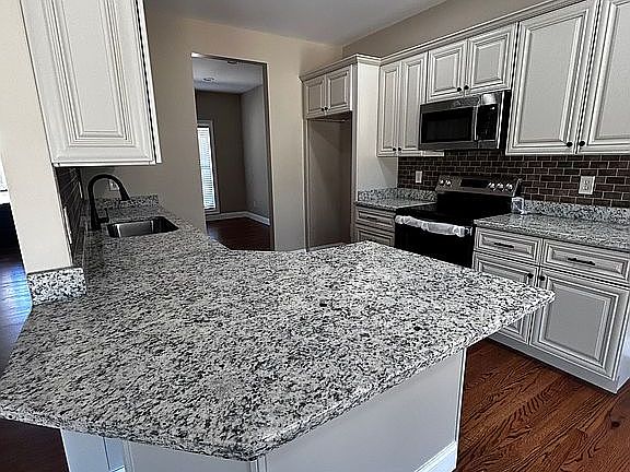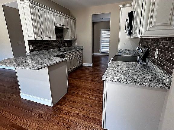 Soaking tubKitchen features granite countertopsLarge laundry roomBreakfast barCustom tile backsplashHardwood flooringVaulted ceiling