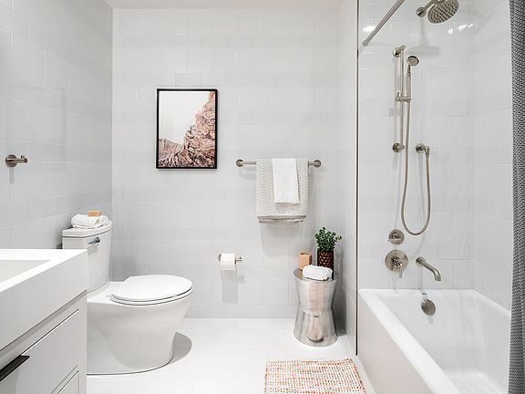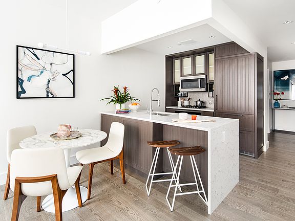 Residence 409 defies all expectations of loft studio living. At EVGB, studios with oversized windows, gorgeous finishes, walk-in closets, and a huge kitchen with space to cook an actual meal are the new normal. The kitchen is outfitted with Miele and Bosch appliances, Cosentino Silestone Quartz countertops and backsplash, and unique wood and glass cabinets with gunmetal pulls. Entertain friends at your breakfast bar, do laundry in your washer/dryer, and sleep at night with custom blackout shades. Relax in your Porcelanosa tiled bathroom with Kohler and Waterworks fixtures. This apartment is finished with hardwood white oak flooring.