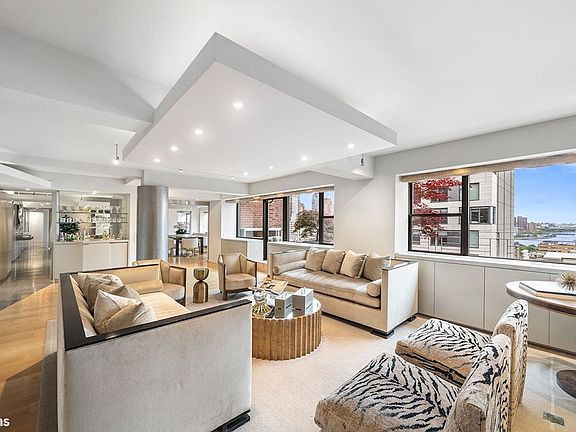 Architecturally distinctive, the dramatic entry gallery features two floating concrete walls, each displaying artwork in an almost "gallery-like" setting. From there you enter the double size Formal Dining Room. This space is large enough for 2 square tables seating 8 at each, or a long harvest-like table, which 14+ can dine. From this room, the exposure is Northeast and includes 6 windows of open city and East River views. The room feels almost loft-like until you close the 3 sets of fluted glass pocket doors - turning the room into a warm intimate space. A grand scale Living Room is parallel to the Dining Room. It too enjoys 6 windows of open city and East River views! This room opens to the main Northeast facing terrace (30 X 6 ft.), which is a perfect extension of the Living Room. A mirrored wet bar and a half bath complete the Living Room. Adjacent to the Living Room is the 4th Bedroom/Office with an en-suite full bath and cedar closet. This room currently functions as an office with custom designed wood cabinetry including extensive storage, shelving and a built-in desk. The exposure is South with open city views.