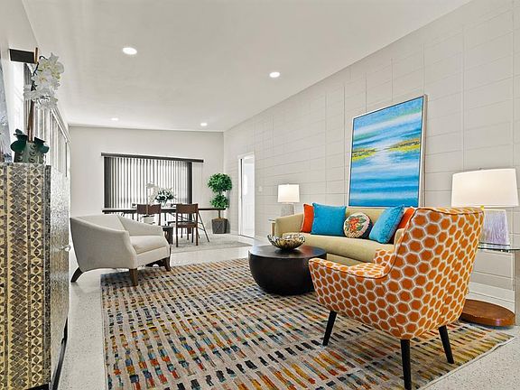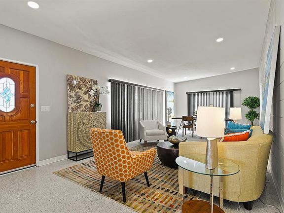 Mid-Century Modern Charm Meets Contemporary Convenience on a 1/4 acre, double-lot. Step into this stylish mid-century modern gem featuring vaulted ceilings and classic terrazzo floors that evoke a cool 1950s vibe. The brand-new kitchen boasts sleek cabinets, countertops, and modern appliances—perfect for both everyday living and entertaining. Enjoy the spacious family room filled with natural light from abundant windows, seamlessly connected to the kitchen for an open, airy feel. The large, fenced backyard offers plenty of space for outdoor fun and games, while the covered front porch invites you to relax and unwind. Two hall bathrooms showcase original 1950s tile, adding a nostalgic touch to this thoughtfully updated home. The three bedrooms offer generous closets and lots of bonus storage. The large laundry and storeroom has its own entrance. Major systems including the roof, plumbing, electrical, and HVAC have all been recently updated, giving you peace of mind. Located just minutes from Downtown Tampa and the vibrant Armature Works entertainment complex, this home offers the perfect blend of vintage style and modern living.