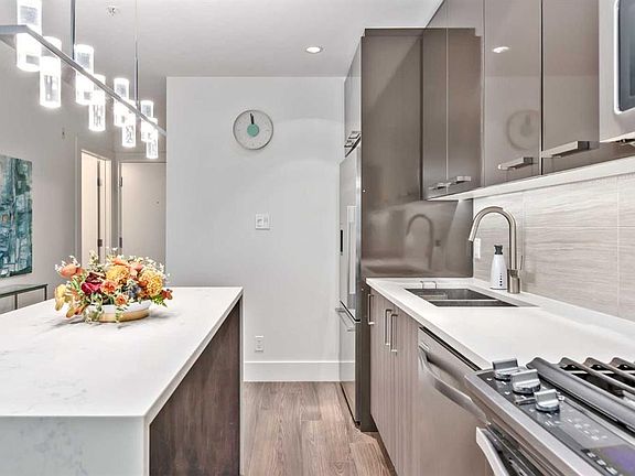 - The kitchen boasts an upgraded waterfall-finish island and modern, sleek stainless steel appliances that will inspire your inner chef to whip up delicious meals daily while the sleek cabinetry provides ample storage