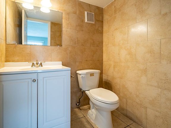The bathroom has just been renovated with all new ceramic tiles, new tub, and toilet.