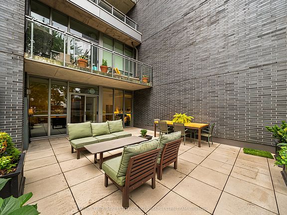 An exceptional 500 square foot private terrace sets this property apart, creating a seamless indoor/outdoor living experience. This expansive urban oasis is perfect for container gardening or simply relaxing in your own private outdoor space. This rarely offered two-bedroom, two-bathroom suite at the Corktown District II Lofts is exceptionally private with only one neighbouring unit and offers a sophisticated urban lifestyle. Inside, the modern loft aesthetic shines with high ceilings, polished concrete floors, and expansive windows that flood the 880 square feet of interior space with soft, natural light from its quiet north-west exposure. The open-concept layout includes a spacious living and dining area and a well-appointed kitchen. The primary bedroom features a private ensuite bathroom. The second bedroom is highly functional, offering a closet and a built-in Murphy bed, perfect for guests. Furthermore, the separate den serves as a fully functional office, affording a couple the ability to both work from home comfortably without compromise. Residents enjoy access to a well-managed building with a range of amenities, including a rooftop patio with city views, a fully-equipped gym, a lounge with a billiards table, and a party room. Located just steps from the historic Distillery District and the Canary District, this property offers an ideal urban lifestyle with trendy shops, acclaimed restaurants, cafes, and beautiful parks right at your doorstep. The sale includes one indoor parking space and a storage locker.
