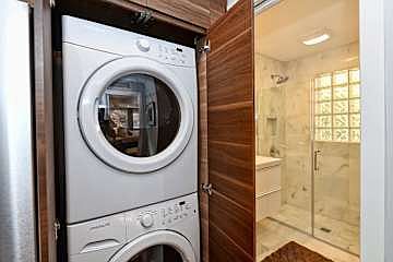 The open kitchen is fully equipped with pots, pans, utensils, etc., a new electric range with convection oven, refrigerator with ice maker, dishwasher, disposal, and a full-size stackable washer and dryer. The dining area comfortably seats four. The kitchen is stocked with everything one would need for a short or longterm stay - down to the garlic press!