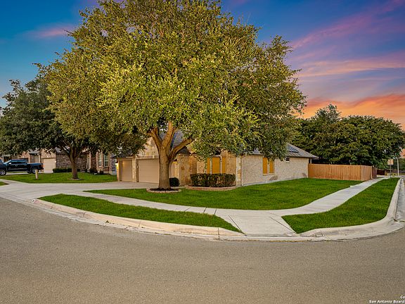 ** NEW ROOF coming soon - ready for new buyer to choose the color!! ** Welcome to this spacious and thoughtfully designed 3-bedroom, 2-bath home with a 3-car garage in the heart of Cibolo! Offering 2,229 sq. ft. of comfort, this 2008 build combines functionality with style-and includes the added benefit of paid-off solar panels for energy efficiency and savings. At the front of the home, a dedicated office makes working from home a breeze-perfect for client visits or simply enjoying the peaceful views of nature. Just off the entry, the formal dining space flows seamlessly into the oversized kitchen with abundant cabinetry, stainless steel appliances, and generous counter space. Designed for entertaining, the open concept offers clear sight lines from kitchen to dining to the expansive living room. The split-bedroom layout ensures privacy and comfort, with only the office and two secondary bedrooms featuring carpet. The rest of the home is finished in attractive laminate wood flooring for style and easy maintenance. Step outside to a xeriscaped backyard (with the option to add sod pathways, as shown in photos) featuring a stunning magnolia tree, covered patio, charming gazebo, and additional landscaping for year-round enjoyment. This corner-lot property sits at the curve of a quiet cul-de-sac, providing both privacy and curb appeal. Located in top-rated SCUCISD and just minutes from Randolph Air Force Base, the community also offers amenities including a pool, park, tennis courts, and walking trails. Schedule your showing today! With mature trees, low-maintenance landscaping, paid-off solar panels, and a flexible floorplan, this home is ideal for families, multi-generational living, or anyone who loves to entertain.