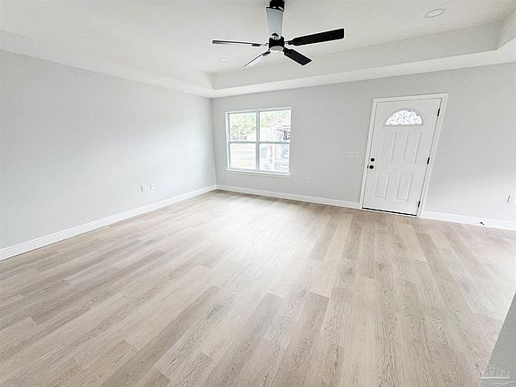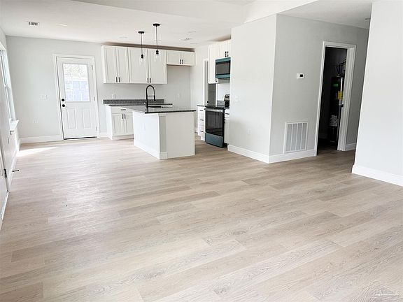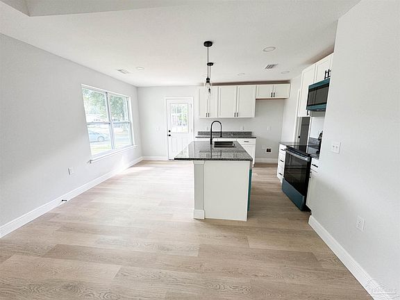 Newly constructed 3-bedroom, 2-bath home on a corner lot featuring an open-concept layout with luxury vinyl plank flooring throughout. The kitchen offers white shaker cabinets, granite countertops, stainless steel appliances, and a center island with pendant lighting. The spacious living area includes recessed lighting and a tray ceiling for added design detail. Both bathrooms feature tile finishes, modern black fixtures, and solid-surface vanities. Energy-efficient construction includes a new roof, HVAC system, water heater, and windows. Exterior features a fully sodded yard, concrete driveway, and covered entry. Conveniently located near shopping, schools, and major routes for easy access throughout Pensacola.