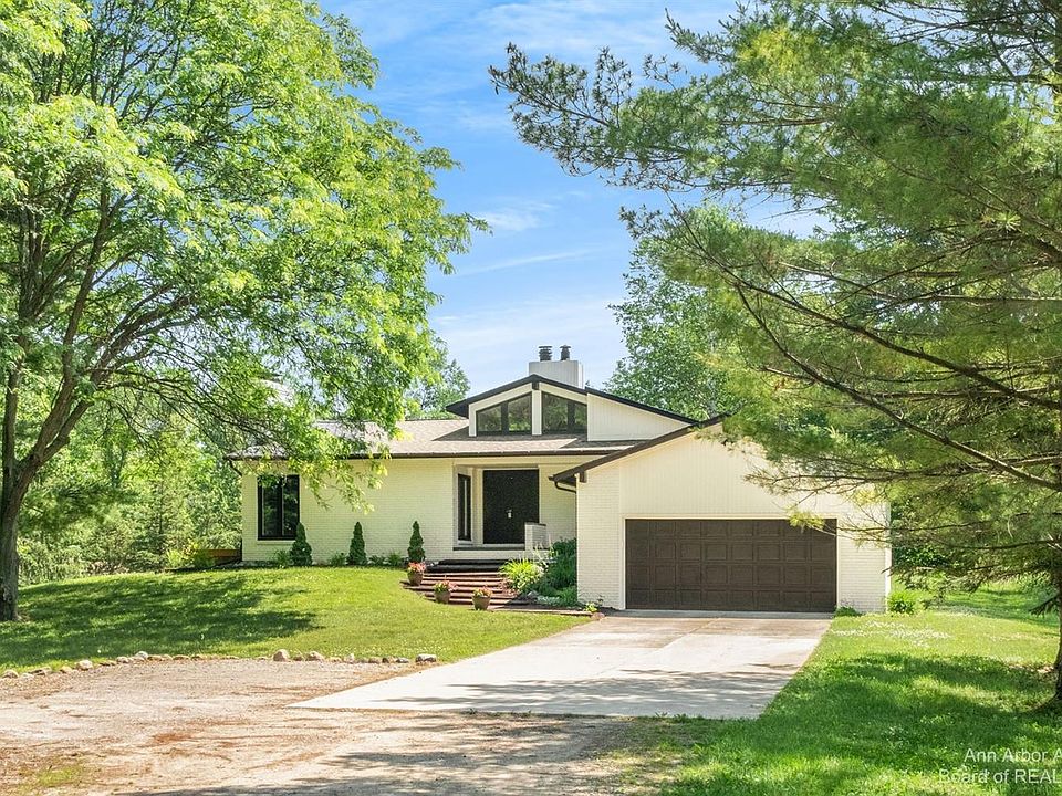 Rare opportunity to find a stylish and modern renovated ranch with 34 acres of peace and privacy just minutes from downtown Ann Arbor! Nearly everything at this impressive home is new - roof, furnace, decks, windows, septic tanks, kitchen, bathrooms...the list goes on! From the sunlit entry you can head to the cozy sunken FR or the open vaulted LR, both with fireplaces for winter warmth and ambiance. The living room has a doorwall to the back deck and large picture windows for ample light and views. The new kitchen has fresh white cabinets, SS appliances, granite counters, and a convenient breakfast bar for quick meals and chats. Attached is both a formal dining room with a doorwall to the second deck and a convenient study/command center. Wake with the sun in three south-facing bedrooms, including the primary suite with a luxurious new private bathroom. Two additional bedrooms share a new hallway bath with dual vanity. Full basement has an abundance of storage space, or finish to double your living space and add an office, rec room, or workshop! Surrounding low-maintenance acreage offers woods, ponds, wetlands, and privacy with plenty of nature to watch and enjoy. Quick to nearby Metroparks, Ann Arbor, freeways, and more!