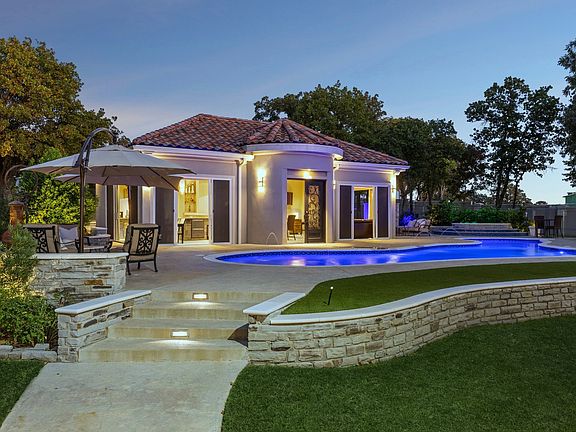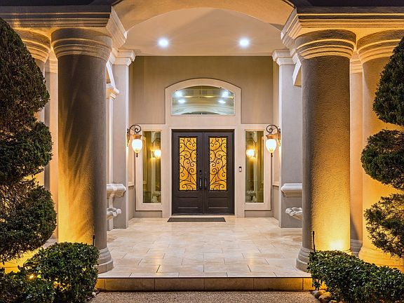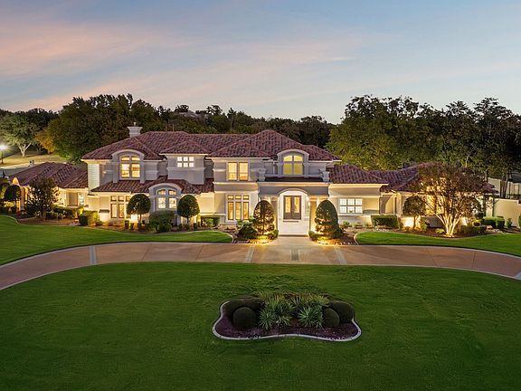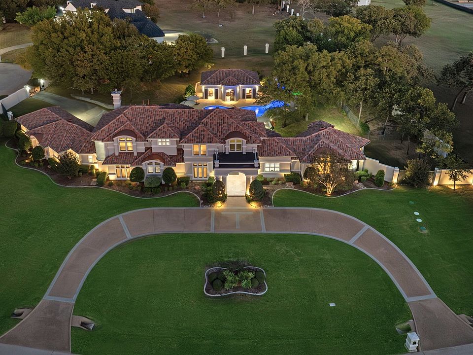 Experience luxury living in the prestigious 24 hr guard gated golf community The Estates at Tour 18, that feeds into exemplary Argyle ISD. With over 7,100+ sq ft of custom construction featuring the extraordinary recent cabana, exterior stone FP, spa and gorgeous hardscape and gardens. Perfectly positioned on a rare corner and cul-de-sac 2 acre+ lot that combines refined design, smart home technology and tranquil year round indoor-outdoor living. Step through double glass + iron doors into a dramatic entry with soaring cathedral ceilings, a striking curved staircase and floor to ceiling windows. The open concept dining area connects to a butler’s pantry and walk-in food pantry with a sleek pocket door and temperature-controlled wine room. The gourmet kitchen features custom wood cabinetry, concealed refrigerator, pot filler, stainless appliances, central island, and bar seating that flows into the breakfast nook and family room with a fireplace, media wall and walk-in bar. The large executive office showcases handsome floor-to-ceiling built-ins with panoramic windows of the backyard. The private primary retreat features extra large sitting area, dual sided fireplace, coffee bar, wellness room, dual vanities, soaking tub, glass-enclosed shower, and an expansive walk-in closet with additional large cedar closet. Upstairs includes spacious secondary bedsuites, a game room with balcony, kitchenette and bar, allowing flexible living spaces. The next level resort-style backyard showcases the meandering resort pool, extra large separate stone spa, freestanding stone FP, and the recent luxury cabana equipped with full kitchen, separate dining room and living space — grill, large stone island bar, dishwasher, ice maker, warming oven, and refrigerator. Finished with a Spanish tile roof, gated motor court, extensive sound and security systems, additional parking for events + five-car garage. An amazing estate and well priced opportunity to own in the coveted golf community.