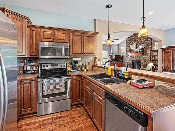 This stunning 4 bedroom 3 bathroom home is a true gem, nestled in a tranquil neighborhood with easy access to Fort Riley and westside Manhattan. As you enter, you are greeted with an inviting, open concept living area that features vaulted ceilings and stone-accented gas fireplace, creating a cozy and elegant space. Dining room with wood flooring open to kitchen with stainless steel appliances, beautiful cabinetry, and convenient eating bar perfect for entertaining. The primary suite with vaulted ceiling feels peaceful and serene as you step out to the patio and the natural surroundings. Enjoy your private Oasis! En-Suite with dual vanity, shower, and walk-in closet. Basement living area is freshly painted with western sun that feels bright and airy. Two guest bedrooms are spacious with access to full bathroom. The home has a BRAND NEW ROOF and gorgeous copper gutters! Mary Scharfe Back 9 Realty 7856.317.2138 Call today to tour the home next to open green space, great location!