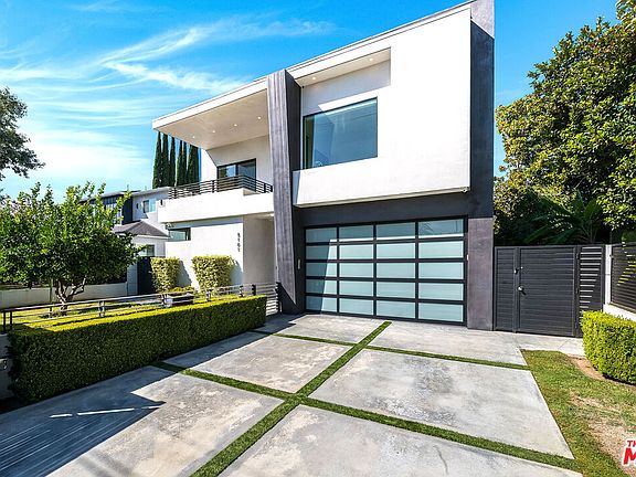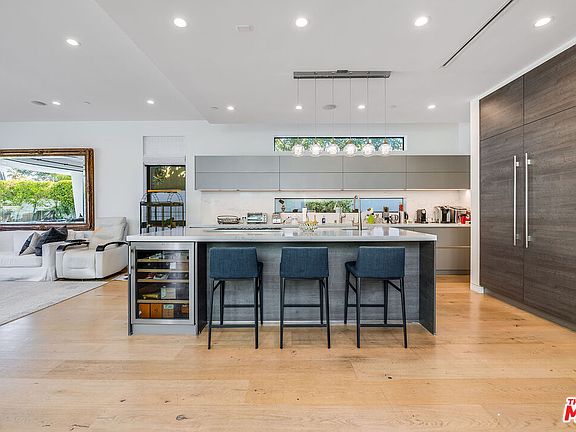 Sleek, custom-built modern masterpiece located on a quiet, tree-lined street in prime Encino. This one-of-a-kind residence showcases high-quality craftsmanship, clean architectural lines, and seamless indoor-outdoor flow across an expansive open layout. A dramatic entry welcomes you into soaring double-height ceilings and walls of glass that flood the interiors with natural light. The main level features wide-plank European oak floors, a spacious great room with fireplace, and retractable glass doors that open to the private backyard oasis. The gourmet kitchen is a showpiece, outfitted with custom European cabinetry, sleek stone countertops, and a large center island. Top-of-the-line appliances include double ovens, dishwasher, microwave, espresso machine, and wine cooler, complemented by a Sub-Zero refrigerator. A formal dining area and covered outdoor living room with fireplace make entertaining effortless year-round. Upstairs, the primary suite offers a private balcony overlooking the lush yard, a fireplace, large walk-in closet, and a luxurious spa-style bath with designer finishes. Each additional bedroom includes its own ensuite bath and walk-in closet. The backyard is a true retreat with a sparkling pool, spa, and manicured landscaping providing ultimate privacy and tranquility. Additional amenities include a two-car garage, surround sound, and security system with cameras. A rare blend of modern elegance and functionality - this exceptional Encino home is the epitome of sophisticated California living.