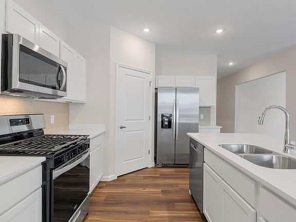 Flex roomOpen-concept floor planMarble dual sink vanityStainless steel appliancesWhite cabinets