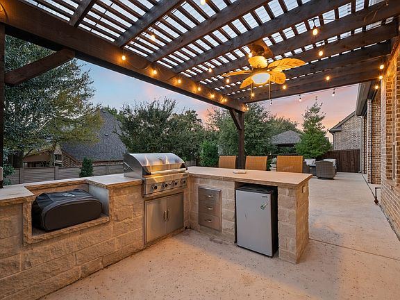 Welcome to this beautiful, lovingly maintained home in the private, gated community of Preservation in the heart of Colleyville and just blocks away from a variety of shops and restaurants and a quick drive to DFW airport! As you pull up to the home, mature landscaping greets you with the HOA maintaining the front and side yard and the 2 car garage offers ample storage space with built in cabinets with shelving. Handscraped hardwood floors flow throughout and seamlessly connect the designated office space to the elegant formal dining room. The eat-in chefs kitchen is a standout, featuring a recently installed Wolf stovetop, a sleek backsplash for easy maintenance, level 8 quartz countertops and an expansive island, wine fridge, custom pull-out soft close cabinet shelves and the custom pantry is designed to fit small appliances and has a butcher block countertop. The primary suite is a true retreat with a soaking tub, separate shower with a new shower head, and a spacious walk in closet with optimal storage space. Outside is a personal oasis with a covered patio with UV screens, custom lighting, while turf provides easy care and maintenance. The oversized covered patio with an outdoor kitchen and built in grill, bar and seating provides the perfect spot for entertaining or unwinding. This home truly has it all, come see it today!