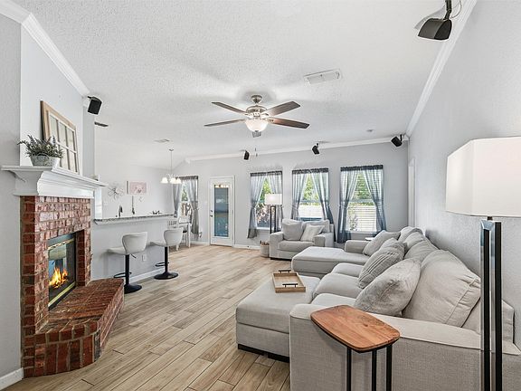 Beautifully remodeled 3-2-2 in an unbeatable location close to everything you need! This home features an inviting open floor plan with a cozy corner fireplace, brick hearth, crown mantel, and sleek vinyl plank flooring throughout. The kitchen shines with stainless steel appliances, granite countertops, and a tumble marble backsplash. Enjoy added touches like crown molding and surround sound. The spacious primary suite offers dual sinks, a garden tub, separate walk-in shower, and generous walk-in closet. Outside, relax or entertain on the large Trex deck overlooking the fenced yard. With a two-car garage and modern updates already complete. Come see this home today!