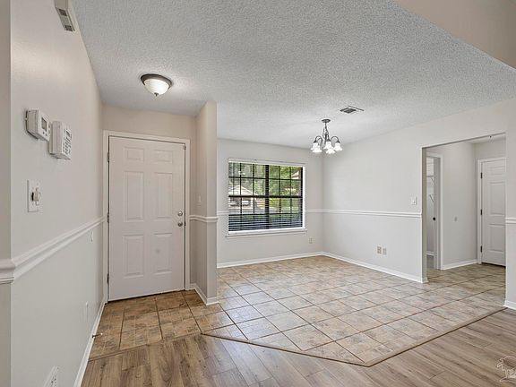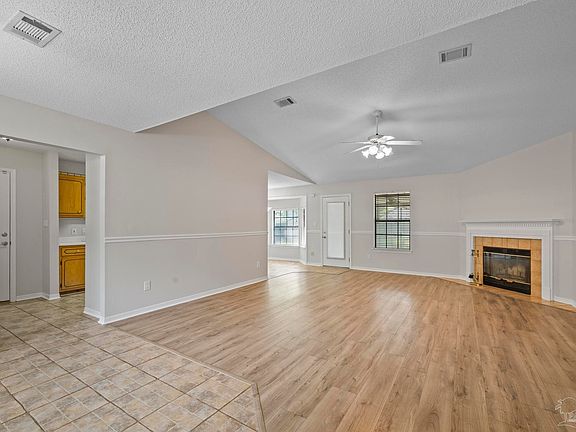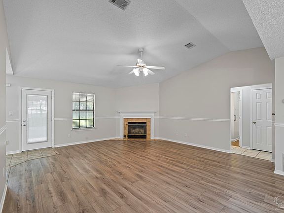** FRESH PAINTED INTERIOR, DOOR and SHUTTERS ** PACE SCHOOLS ~ NO CARPET ~ SCREENED PORCH ~ FENCED BACKYARD ~ Hurry to see this all brick home at a great price! Foyer leads to open GREAT ROOM with vaulted ceilings and fireplace. DINING ROOM to left of foyer has tiled floors and chair rail. KITCHEN has tile flooring, pantry closet, and refrigerator conveys plus BAY WINDOW eat in area overlooking the backyard. PRIMARY BEDROOM has LVP flooring, walk in closet plus ensuite PRIMARY BATHROOM with double vanities and garden tub/ shower combo. BEDROOMS 2 & 3 share a HALL BATH in this split floor plan. Other amenities include: Separate LAUNDRY ROOM; SCREENED PORCH, pull down stairs in GARAGE; SHED (as-is); FENCED YARD; ROOF 2023; WATER HEATER 2021; HVAC 2007. Make your showing appointment and get your offer in!