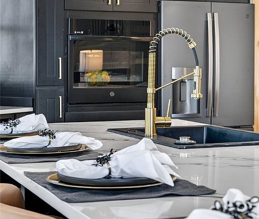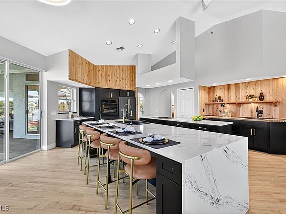 Recently remodeled sailboat-access pool home offering breathtaking intersecting canal views on an oversized lot with 215 feet of water frontage in a prime Southwest Cape Coral location. The stunning chef’s kitchen features a double island with quartz countertops, a spacious breakfast bar seating four, new GE appliances, custom black cabinetry with elegant gold hardware, and panoramic views of the pool and canal.