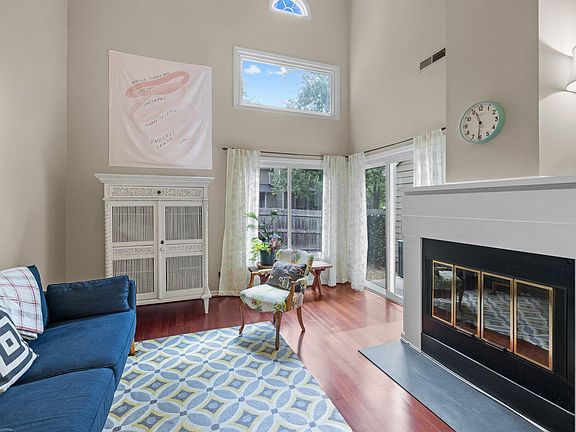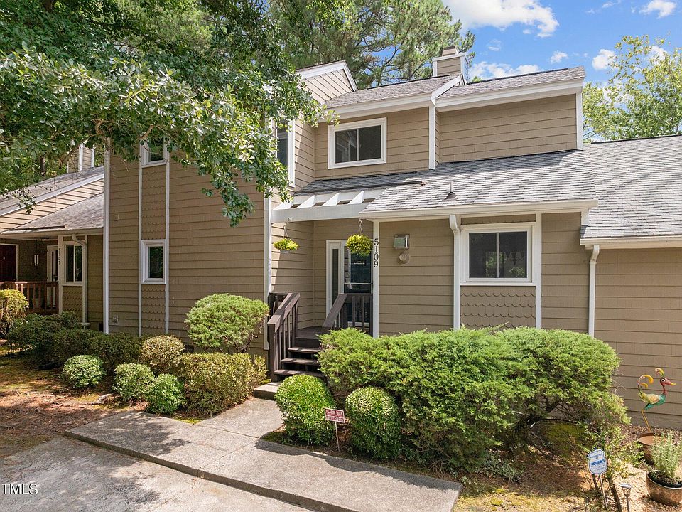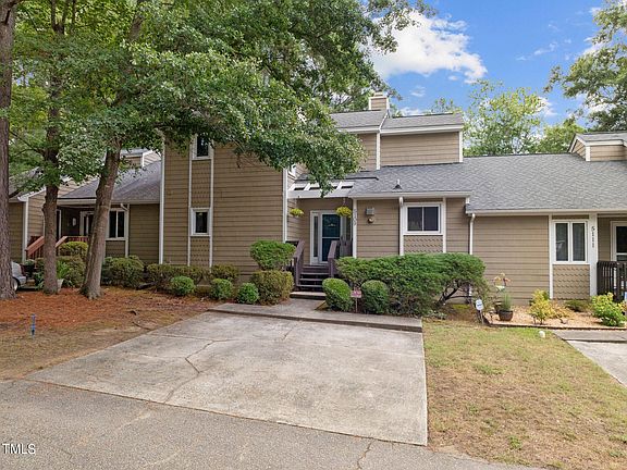 Stylish townhome in the Lakeside - Five Oaks community with a bright, open floor plan. This unit boasts an ideal ''roommate'' floor plan with a bedroom and bathroom on main floor, then 2nd floor = bedroom with an ensuite private bathroom, plus an open loft ''lounge'' with a large closet; Wood floors throughout both levels, updated windows, updated lighting and Zero carpet! Enjoy the cozy deck off the downstairs bedroom, opening to the large backyard. A level lot hemmed by the 6' privacy fence offers plenty of space to garden, entertain and play! A wood-burning fireplace, 1st floor smooth ceilings, 1st floor laundry, two exterior storage closets, a front porch, dedicated double parking pad and back patio, all round out the features offered by this home. Equal distance to UNC Chapel Hill and Duke University, you will have easy access to I-40, shopping, restaurants, and a quick commute to RDU International Airport. Tucked away on 36 acres of quiet forest, the Lakeside community includes wonderful amenities galore: clubhouse, pool, pickleball courts, tennis courts, fitness center, playground with a full basketball court, dog park, lake fishing, green space, and hiking trails.