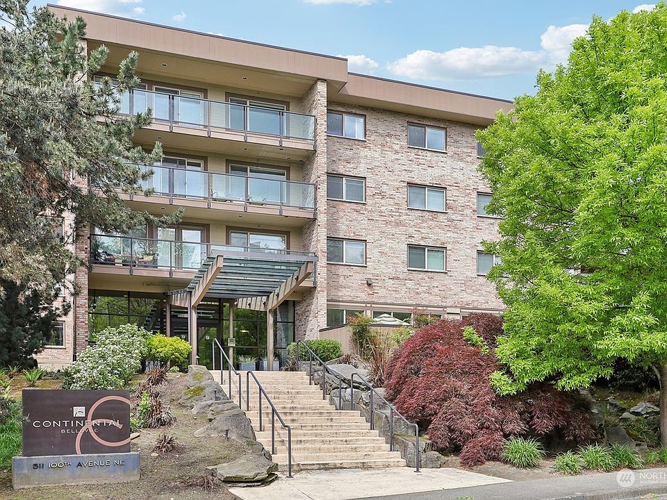 Experience lifestyle & sophistication at the iconic Continental, just across from Bellevue Square! This boutique living gem offers an alternative to high-rise condos. Enjoy convenience with all amenities nearby, including upscale shopping, dining, nightlife, DT Park, and Meydenbauer Beach Park. Completely remodeled in 2009, this mid-century modern building brings nature's beauty to urban living. This inviting 1-bed, 1-bath condo boasts a well-appointed kitchen, sun-filled living room w/ a Romeo & Juliet balcony, rooftop deck, secured building, one reserved parking space, and a large storage unit. With fresh paint & new carpet, it's move-in ready. In the Bellevue School District, w/ no rental cap & a well-run HOA. Your urban oasis awaits!