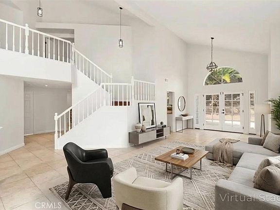 Step inside to a light-filled, open-concept floor plan featuring soaring vaulted ceilings and distinct living, dining, and family rooms, plus the convenience of a downstairs bedroom and full bath, perfect for guests or multi-generational living. Upgrades abound throughout, including tile and wood flooring (no carpet), recessed lighting, and elegant finishes. The dramatic living room showcases impressive ceiling heights, while the dining room opens through French doors to a private backyard oasis.