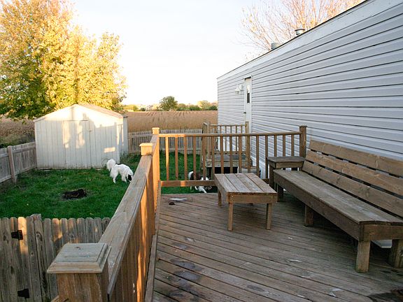 Located within the New Horizons community in Huxley. The yard has established apple trees, a large strawberry bed, and blackberry bushes. A portion of the yard is fenced with 4' wood privacy fencing and an unfenced garden area is located behind the home. A large deck, stove, fridge, and 10' X 10' storage shed are included with the home. The home has an open floor plan with vaulted ceilings in the kitchen and living room. Living room is wired for surround sound. The furnace and roof were installed 8 years ago and are still in warranty. Home was professionally weatherized 2 years ago. A 2 car cement driveway provides ample parking. The Heart of Iowa hiking trail are located less than a 5 min. walk from this home. Home does need some updates (carpet in bedroom, linoleum in bathroom, and new windows) and is sold as-is. In order to buy this home you do need to pass a background check with the park manager (unless you wish to move the home out). Lot rent is $283/mo. Including water and trash I pay about $330/mo total plus utilities (utilities $115/mo). Pets are allowed but must weigh under 20 lbs. Asking $7000 OBO. Selling and will be ready for move-in by Jan 1, 2015 at the latest.