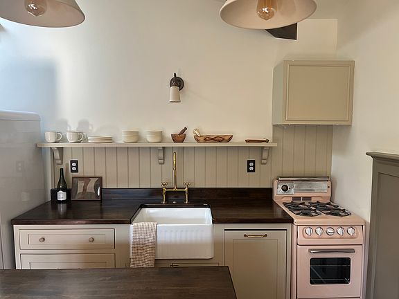 - Gourmet Kitchen: Inset cabinets, butcher block countertops, an unlacquered brass faucet, a walk-in pantry, and a versatile kitchen island on casement wheels.
