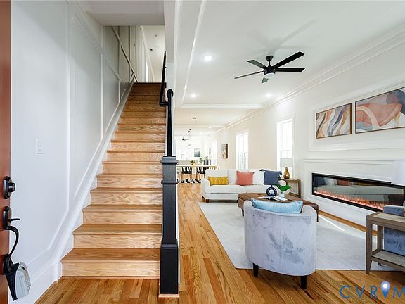Located on a quiet street in Richmond’s historic Church Hill neighborhood—just steps from Chimborazo Park, local restaurants, and shops—511 N 33rd Street offers a seamless blend of quality craftsmanship and modern design. This newly constructed home features 2,240 square feet of bright, open living space with 3 bedrooms, 2.5 bathrooms, 10-foot ceilings on the main level, and site-finished hardwood floors throughout. From the covered front porch, step into light-filled living and dining areas showcasing detailed trim work, crown molding, and a sleek 70” electric fireplace. The gourmet kitchen is a standout with custom cabinetry with lighting, quartz countertops, a waterfall island with seating and storage, high-end stainless steel appliances, gas cooking, wine fridge, pot filler, and a dedicated workspace with open shelving. Upstairs, retreat to the luxurious primary suite tucked at the rear of the home. It offers a large walk-in closet, a second electric fireplace, and a spa-like en suite bath featuring a double vanity with marble countertop, a spacious walk-in shower with dual shower heads (including rainfall), frameless glass door, and a built-in bench. Two additional bedrooms feature hardwood floors, recessed lighting, ceiling fans, and generous closet space. They share a well-appointed hall bath with a double vanity, granite countertop, tile flooring, and a fully tiled tub/shower. Additional highlights include tankless hot water, upstairs laundry, a large rear deck, a fully fenced backyard, and space for off-street parking—perfect for convenience and outdoor enjoyment. Don’t miss this exceptional new home in one of Richmond’s most beloved neighborhoods!