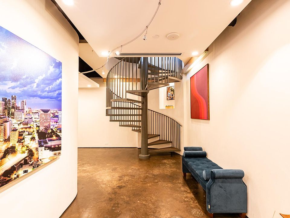Entryway has cloud ceiling, track lighting, and spiral staircase. Concrete floors throughout.