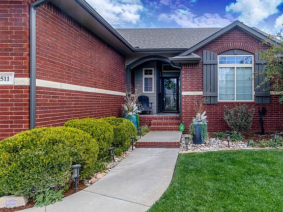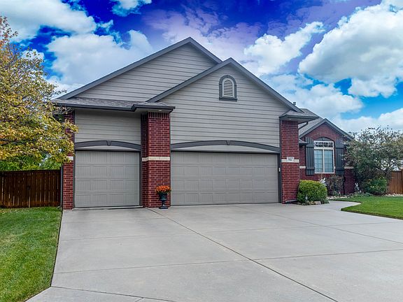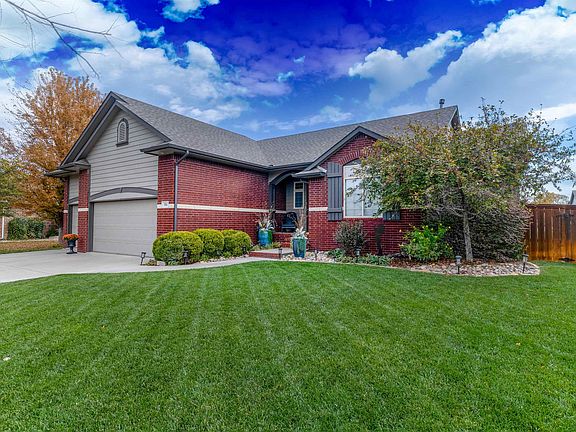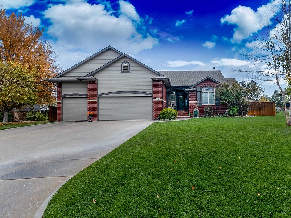 This stunning five-bedroom, three-bathroom home with a three-car garage is located at the back of a quiet cul-de-sac, offering privacy and breathtaking landscaping. The property features a fenced yard, sprinkler system, and irrigation well, ensuring a lush and beautifully maintained outdoor space. Inside, the main floor boasts a spacious open split-bedroom floorplan with 10-foot ceilings and hardwood floors in the living areas. The kitchen is a chef’s dream, with an oversized walk-in pantry, granite countertops, an island, and an updated tile backsplash. The adjacent living room is filled with natural light from large picture windows and features a gas fireplace, built-in niches, and cabinetry. A new Pella sliding glass door with built-in privacy shade provides access to the outdoor living area. The master suite offers luxurious comfort with custom drapery, a remodeled en suite bath, a jacuzzi tub, a separate shower, a water closet, and a large walk-in closet conveniently connected to the main floor laundry room. A built-in drop zone off the garage entry provides a practical space for organizing shoes, bags, and other essentials. The true walk-out basement is perfect for entertaining, with a spacious family room, a gas fireplace, built-in bookshelves with lighting, and a dedicated area for a pool table. The lower level also includes two additional bedrooms, a bathroom, and an extra finished room for versatile use. Outdoor living is a delight with a covered pergola deck, a custom concrete-coated oversized patio, and immaculate landscaping. Recent updates include a rebuilt deck, a newer Rheem AC unit, and a remodeled master bathroom. Additional features include a water-source backup for the sump pump and custom drapery throughout the home. This home combines thoughtful design, luxurious finishes, and meticulous maintenance, making it the perfect blend of style and functionality. Goddard Eisenhower Schools and specials just paid off in 2024.