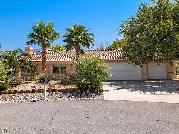 DESERT TRAILS GEM WITH STUNNING MOUNT CHARLESTON VIEWS! ?Discover your dream home in the highly sought-after Desert Trails community! Nestled on a quiet cul-de-sac and sitting on just under 1 acre, this exceptional property offers unmatched views of majestic Mount Charleston. HEATED SALT WATER POOL, SAUNA, 3 Bedrooms | 2 Bathrooms (NEWLY UPDATED| 3-Car Garage 1,923 sq ft of Living Space ON JUST UNDER 1 ACRE Covered deck—perfect for entertaining or relaxing:Cozy brick fireplace in the living area:Ceiling fans throughout the home for year-round comfort:Updated windows and a new HVAC system Relaxing sauna tub in the primary bath :Premier appliances throughout the kitchen:Fully fenced yard with storage shed; Mature beautiful landscaping and fountain. This is your chance to own a slice of paradise with panoramic desert and mountain views, peace, privacy, and space Public water and sewer, Close to shopping, schools, hospitals, and restaurants. And only an easy 50 mile drive to Las Vegas.