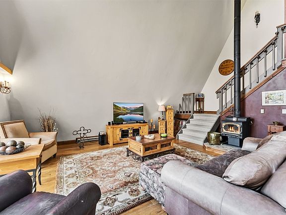 Inside, the home is warm and inviting with soaring vaulted ceilings, a real wood-burning fireplace, and tons of natural light from big windows that bring the outdoors in. The layout is super functional whether you’re living here full-time or using it as a mountain getaway.