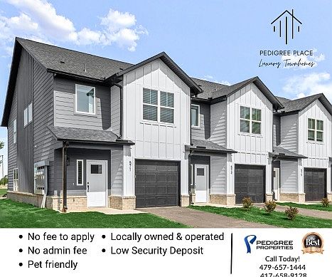 RENT SPECIAL! First month FREE! * No application fee * No admin fee * $32 credit check fee * First pet $250 deposit + $20 monthly fee (NO VICIOUS BREEDS) * Second pet $100 deposit + $10 monthly fee (NO VICIOUS BREEDS) * Owner operated Brand new 3 bed, 2.5 bath, townhome community in the heart of NW Arkansas with FENCED BACK YARD. Less than 15 minutes to the new Walmart Home Office campus, downtown Rogers lake life on Beaver Lake and Lake Atalanta, uptown Rogers concert AMP and entertainment district, downtown Bentonville art and museum district and Bella Vista's multiple mountain biking trailheads. High end finishes include a light and bright design style, garage, granite countertops, LVP flooring, walk-in shower and closets, washer dryer, stainless steel appliances, built in microwave, oversized pantry and more! 1st floor features an open floor plan with kitchen island/bar. 2nd floor includes master suite and ensuite bath with double vanity sinks and tile shower plus two additional bedrooms with full bath. Walking and biking distance to all Pea Ridge Schools and City Park, Pavilion and Splash Pad.