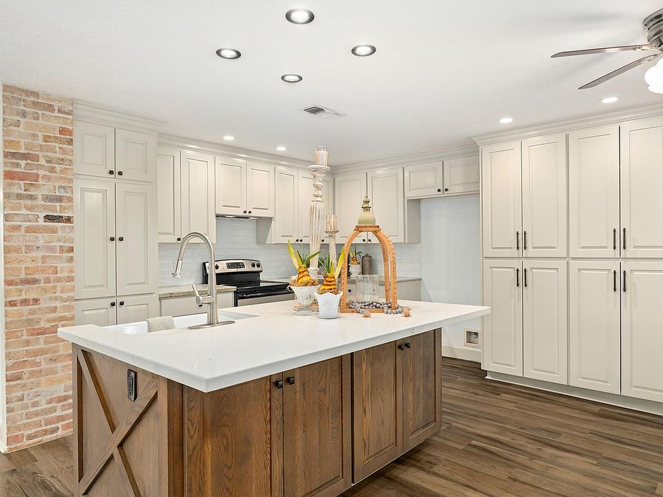 The knockout kitchen has been tastefully remodeled, packed w/ custom cabinetry, abundant cook space, & a huge island for gathering. All bedrooms generously sized, w/ the primary suite featuring updated bath & large walk-in closet.