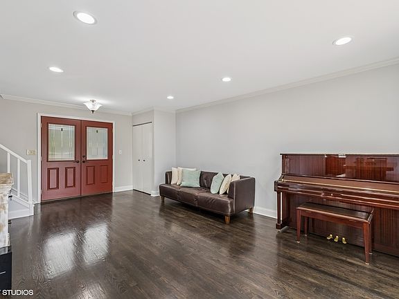 This beautifully maintained 3-bedroom, 1.5-bath home features timeless hardwood floors and elegant crown molding throughout. Step into a bright, airy living room that flows seamlessly into a cozy dining space. The kitchen offers 42" cherry wood cabinets, a generous island, and a casual eating area, perfect for both everyday meals and entertaining. The spacious primary bedroom includes two closets, while two additional bedrooms share an updated full bath with a modern vanity. The finished basement provides extra flexibility and can be used as a home office, playroom, or family room. Enjoy outdoor living with a large backyard, a deck off the living room, and a walk-out patio from the basement. Nestled next to a playground and set in a sought-after neighborhood within the Fremd High School district, this home blends comfort, charm, and convenience.