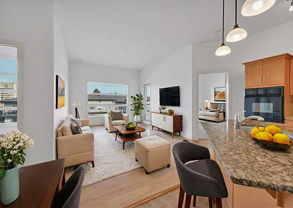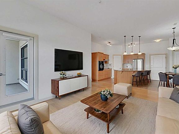 This Brava unit is one of the very few homes that was purchased at the build stage, giving the original owners the ability to customize it specifically for long term accessible living. On the 4th floor you get 10’ ceilings(!), the larger window package unique to the top level, 7’ doors, and an east facing deck with a gas hookup. The kitchen was upgraded at construction with roughly $20,000 in improvements, including maple Westridge cabinetry, a granite island, automatic lighting, durable laminate counters, and many drawers. The primary suite was intentionally designed for mobility and comfort, complete with a walk-in shower, dual vanities, and a heavy duty comfort height American Standard toilet; need a comfortable tub? Find the 6' tub in the main 4pc bathroom. Bamboo flooring, centralized A/C, and the energy efficient fan coil system keep the home easy to live in. The building adds meaningful convenience with a theatre room, games room, full fitness room, rooftop terrace, heated underground parking, and clean, contemporary common areas. Additional parking on the north side of the building - parking pass included. No doubt you'll find that this home was planned properly from the very beginning, with accessibility built in rather than added later - no DIY work, no retrofits needed. No pet home! If you’re looking for a place already set up for ease, safety, and day to day comfort for you or your family members, this is one of the best opportunities where the important work is already done.