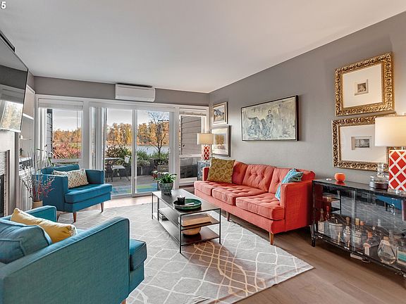 Experience refined living in this beautifully updated 1003 sq ft Rivers Edge Condominium, perfectly positioned in the highly desired Johns Landing neighborhood of South Portland. This two bedroom, two bathroom home blends thoughtful design, elevated finishes, and an exceptional sense of place, creating a residence that is both inviting and sophisticated.The living room serves as the central gathering space, anchored by a warm fireplace and defined by sweeping panoramic views of the Willamette River and the distant profile of Mt. Saint Helens. Large windows draw in abundant natural light, and the addition of air conditioning ensures year round comfort. Whether starting your morning with the serenity of the river or unwinding in the evening as the landscape shifts with the light, this room offers an atmosphere that enriches everyday living.The adjacent gourmet kitchen features quartz countertops, contemporary cabinetry, stainless steel appliances, designer lighting, and a stunning tile backsplash. Engineered hardwood flooring extends throughout much of the home, adding warmth, beauty, and enduring durability.Step outside to your partially covered ground level patio, a peaceful retreat offering a front row view of the river. From quiet mornings to relaxed evenings under the sky, this outdoor space enhances the condo’s connection to nature.The primary bedroom is spacious and serene with a custom closet, while the second bedroom features a well designed Murphy bed, making it ideal for guests, a home office, or a flexible multi-use space. The remodeled bathroom showcases quartz countertops and contemporary finishes, introducing a modern touch. Two assigned parking spaces, including one covered, add ease and convenience. Located just minutes from the vibrant restaurants, local markets, and boutique shopping of Johns Landing, this Rivers Edge Condominium offers a rare blend of natural beauty and urban access.