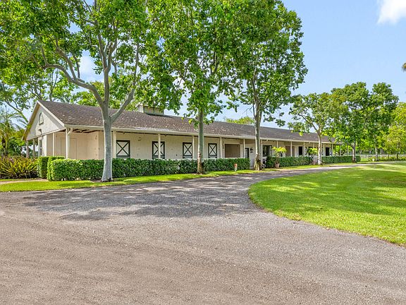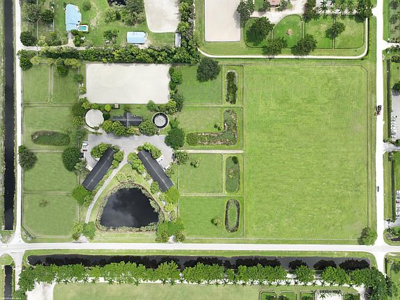 Exceptional 19.83-acre equestrian estate, just a short ride to the Wellington International show grounds and National Polo Center. This spacious equestrian compound is a testament to dedicated equestrian pursuits, offering an unparalleled training environment with two mirror-image barns housing 32 stalls.The expansive grounds feature a new 150' x 300' all-weather arena with a covered viewing area, a sprawling 7-acre grass riding field, a round pen with all-weather footing, and a Kraft five-horse walker. Nine oversized grass paddocks provide ample room for turnout, a true luxury in Wellington.The property also includes two 3-bedroom 1 bath staff apartments and a separate owner's lounge, ensuring comfort and privacy. With two screened patios overlooking the tranquil pond, this is a rare find offering an uncompromising blend of functionality and luxury, for equestrian pursuits.