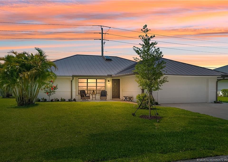 A true coastal gem! This beautifully updated, fully furnished, concrete block home is nestled in Country Club Cove, an intimate community of just 54 homes. The modern kitchen features newer stainless-steel appliances, quartz counters, a stunning backsplash, and a stylish farmhouse sink. Vaulted ceilings with skylights fill the open-concept living area with natural light, creating an inviting space for relaxing or entertaining. Enjoy the large screened, tiled patio—perfect for outdoor living. Easy-care luxury vinyl flooring runs throughout. Recent updates include fresh paint inside and out, LED lighting, smart ceiling fans, new landscaping, new roof 2025, new gutters, new hot water heater, 2023 A/C system with ducts replaced, and full accordion shutters for peace of mind. HOA covers the community pool, lawn care, and cable. Optional membership to Miles Grant Country Club offers golf, casual and fine dining, and more. Just minutes to Cove Road Park for river access and picnics.