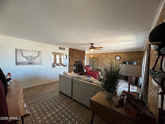 Beautiful updated 3B 2B home on an acre in the quite Harquahala Valley. The most gorgeous mountain views. A horse lovers paradise complete with horse pens and shade. 30 amp RV hookup for guest. 220V hot tub hook up. You can ride out for miles. The home has a unique two way fireplace between the living room and the dining room. The kitchen boast a breakfast bar, wood sealed countertops, newer appliances, reverse osmosis and a pantry. New flooring throughout home. Updated bathrooms with a glass/tile shower. Big laundry room with exit door. Three good sized bedrooms with walk in closets. Private well with 3,000 gallon strorage tank. Newer roof/AC. Bacteria guard salt free three stage filtration system. If you want to live out of town this is a must see home that is priced to sell quick.