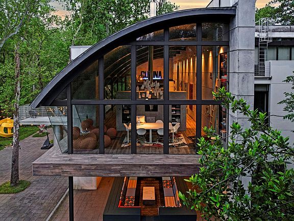 Modern strong mixed materialsSummer kitchenFloor-to-ceiling glassDining roomAbundance of natural lightClean line designHome theater-game room