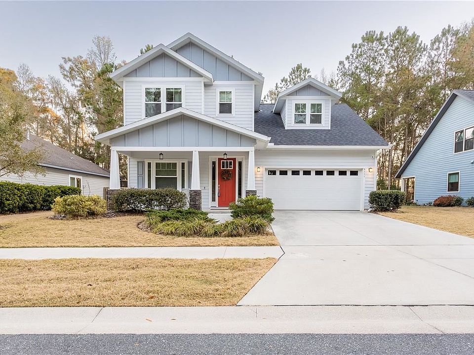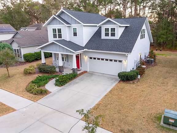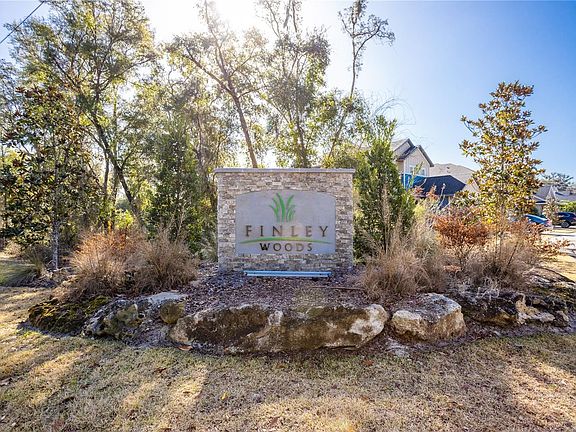 Pristine and elegant two story home in Finley Woods! This 2015 custom built home features four bedrooms two and a half bathrooms PLUS an office or fifth bedroom, screened in back porch, workshop in garage, and more! No detail was spared when building this home. Upgrades include decorative lighting in the kitchen and dining, crown molding on the first floor, built-in mud bench in the foyer, gas fireplace and gorgeous wood floors in the great room. The panoramic kitchen boasts counter height quartz island with built in shelving, stainless steal farm sink, gas range and brand new full-depth french door refrigerator. The primary bath has dual sinks, granite counters, custom tile work and an extra large shower with two shower heads. Low utility bills! The average electric bill which includes 2.1 kw solar panels and clay electric is approximately $130/month. The oversized two car garage includes a workshop area with plumbed wall and floor drain with plenty of space for storage PLUS a generator hook-up. The association dues include front yard maintenance. Located toward the end of the street surrounded by nature. Amazing location, 5.7 miles to Shands/UF, 9 min to Butler Plaza and Celebration Point, 5 min to I-75. What an extraordinary place to live!