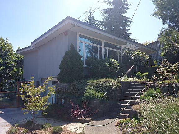 Mid century modern home w/captivating vistas of the Puget sound lovingly restored on over sized grounds in desirable North Admiral location! Nestled in a unique setting amongst beautiful gardens and towering trees on a quiet street end across from bluff above Alki Beach! Formal living & dining rooms w/vaulted ceilings, sit down views, hardwoods, fireplace & wall of windows. Sunny kitchen overlooking gorgeous rear yard w/mature landscape, arbors, lawns & private patio. New roof in 2006.