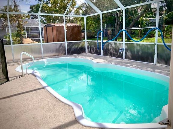 Beautiful 3/2/2 brand new roof, recently re-screened pool enclosure for the refurbished in ground pool. This homes exterior and interior is newly painted, Split plan home features wood plank laminate floor throughout all the living areas. Great room with cathedral ceilings, Eat in Kitchen with granite countertops, Newer appliances, Cabinets 2yo, Master bedroom with walk in closet, Master bath with granite countertops, dual sinks and shower. Additional bedrooms also have walk in closets. Guest bath granite countertops and bathtub. Inside Laundry . window treatments remain. A/C only 3 yr, Hot water heater 3 yr, Security system with cameras, Main door alarm, child safety fence around pool, Chain link fenced in yard. Insulated garage door, shed for additional storage remains.