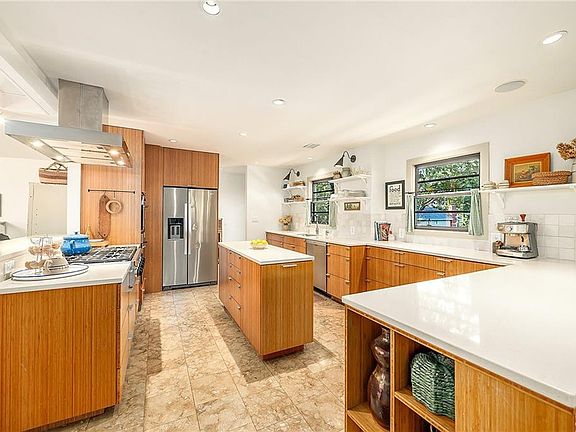 This spacious 5-bedroom, 4-bath modern contemporary, designed by architect Bill Poole, combines striking style with livable comfort in the very heart of Prairie Village. The versatile layout offers multiple living spaces on both the main level and in the professionally finished lower level. The open floor plan showcases vaulted ceilings, hardwood floors, dramatic statement lighting, and a soaring art wall that fills the dining space with natural light. Cozy living space with a fireplace seamlessly works into the functional floorplan. A gourmet kitchen with custom bamboo cabinets and high-end appliances is perfectly suited for entertaining. The expansive 17x20 primary suite offers a spa-like remodeled bath with a double sink vanity, walk-in shower, and separate jetted tub, while a second main-level mini-suite provides flexibility and a second ensuite bath on the main level. Don't miss the custom closet details! Relax on the spacious screened-in porch overlooking the special backyard, it is truly one of the showstoppers on this beautifully unique home. The finished lower level adds even more living space with a versatile bonus room, full bath, and two additional bedrooms. Fresh, airy, and artfully designed, this is a rare modern gem. Great Prairie Village location near restaurants, parks, great schools and shopping. Move in and enjoy! **Living room carpet credit would be agreeable with acceptable offer**